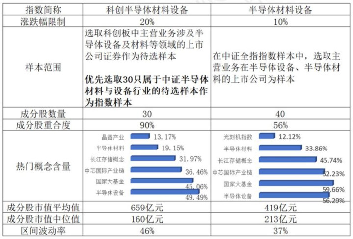 从标的选择上来看,目前市场上聚焦半导体设备的指数有两只,分别是中证半导体材料设备以及科创半导体材料设备指数。前者是科创板中唯一聚焦半导体设备的指数,后者体现行业整体布局,是全市场半导体设备含量最高的指数。(数据来源:iFinD,成分行业按申万三级行业划分)